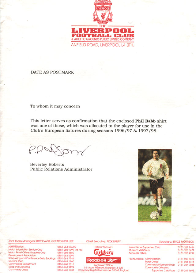 | This Phil Babb shirt comes with a letter issued by Liverpool FC for authentication. | |||||||||||||||||
