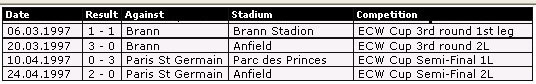 | To be exact, the non-sponsored ecru away shirt was worn against Bergen Brann in the 3rd leg away match on 6 March 1997 and Semi Final away leg on 10 April 1997 against PSG. | |||||||||||||||||